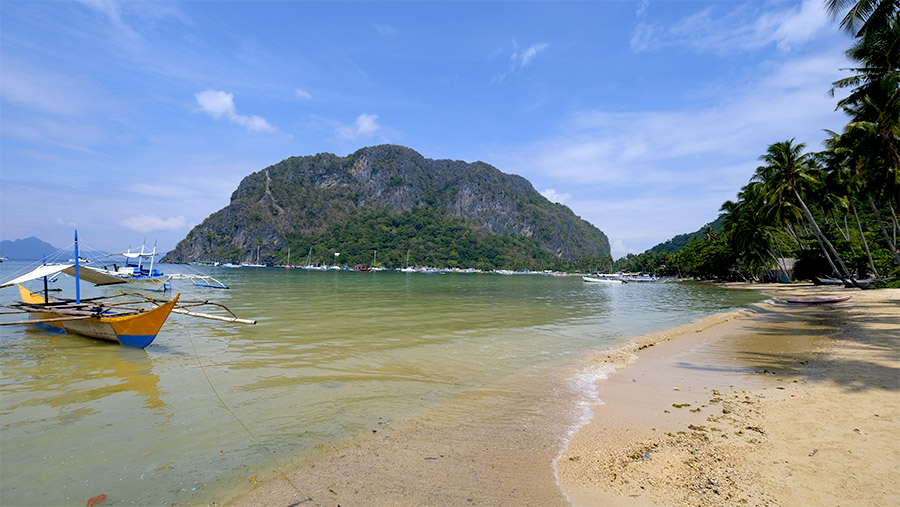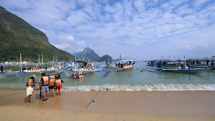Je suis arrivé sur la plage d’El Nido. C’est vraiment très beau. C’est le matin et donc c’est l’heure du départ de toutes les excursions en bateaux. Et ici les gens viennent pour voir les iles donc tout le monde prend le bateau. Vous avez le choix notemment de 4 tours principaux pour visiter les iles alentours, qui sont nommés A, B, C et D, et pour ma part je vais tester le tour A, qui sera le thème de la prochaine vidéo. Beaucoup de bateaux donc, avec en moyenne une trentaine de personnes à bord de chaque bateau. Pour ma part j’ai eu un peu plus de chance, car nous n’étions qu’une douzaine. Je précise qu’une fois que tous les bateaux sont partis la plage devient relativement calme. Voilà j’ai parcouru toute la plage, c’est assez long comme vous pouvez le voir, il y a de la place. J’aime beaucoup le design des bateaux, ça fait très exotique.